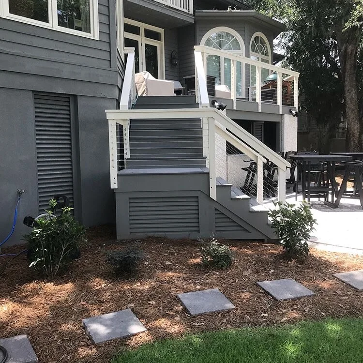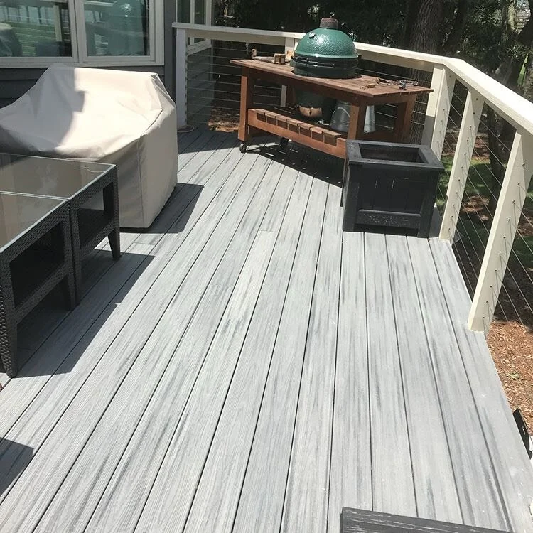 Ocean front deck installed with a solid Trex deck and modern cable railing.